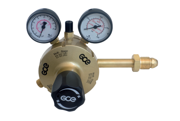 Reguladores de doble etapa GCE están diseñados para proporcionar estabilidad, y un suministro libre de fluctuaciones para aplicaciones de precisión como abastecimiento de máquinas, pruebas de fibra óptica, regulación eficaz del CO2 y N2O y todo gas que tenga tendencia a enfriar durante su descompresión, aplicaciones donde se requiere de una presión estable cual sea el flujo de la presión de cilindro. La primera etapa reduce la presión de entrada más del 90% y el gran diafragma de la segunda etapa asegura el suministro de presión.