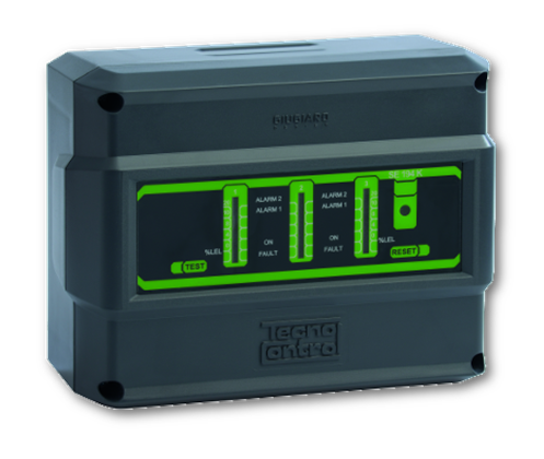 Las centrales están equipadas con tres barras LED que indican la concentración de gas alcanzada. El LED verde indica aire fresco, el primer y el segundo LED rojo indican la contaminación y el tercer y cuarto LED rojo indican la conmutación del relé de alarma. El LED amarillo indica una anomalía del sistema y opera el relé de falla.
