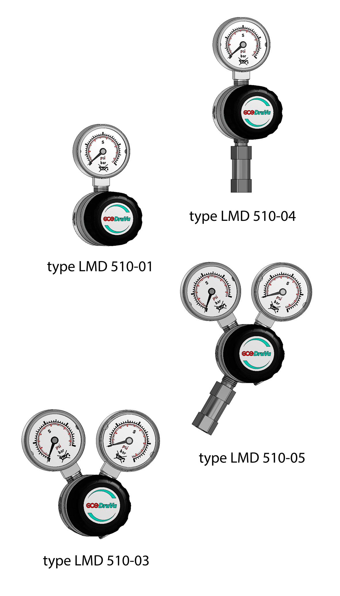 La serie LMD destaca por su asignación precisa de presión, necesidad de espacio mínimo y uniformidad de presión aguas abajo. Por esta razón, esta serie es particularmente adecuada para alto rendimiento y el suministro de gas stabil como sería necesario para las aplicaciones analíticas o donde el espacio de presión de ahorro regular con formas de conexiones cortas al punto de uso que se requieren. Hay versiones que contiene un indicador de aguas arriba, además de opción de válvula de seguridad .