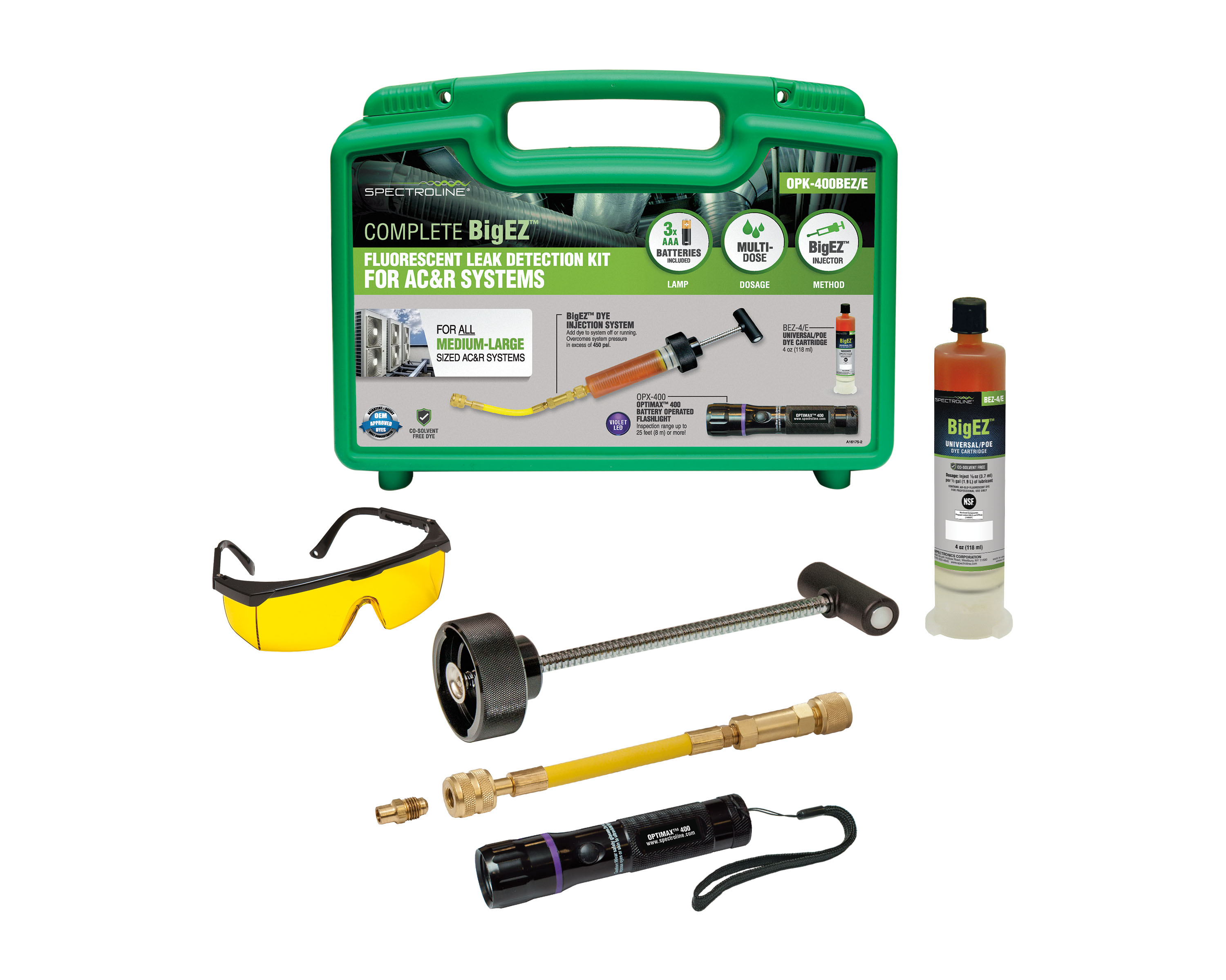 Incluye la OPX-400 Optimax 400, linterna detectora de fugas con luz violeta económica, sin cables y alimentada a baterías.